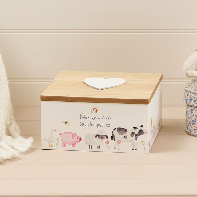 "Our special baby keepsakes" box illustrated with farm animals, sunflower and rainbow. The box features a natural wood lid and a white 3D heart on top.