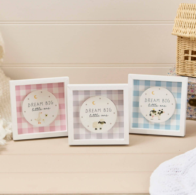 Mini Wood Framed Easel Plaques, each featuring a round ceramic center with "DREAM BIG little one" text and small farm animal illustrations.