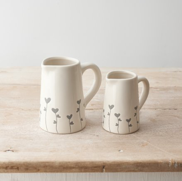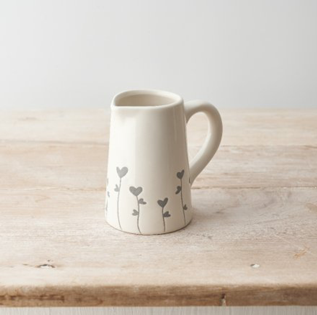 A dainty ceramic jug with a grey floral and heart design. A stunning interior accessory to display as pictured or fill with your pick of seasonal blooms.